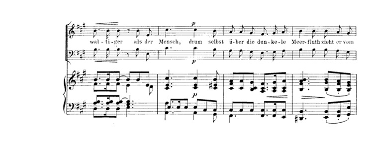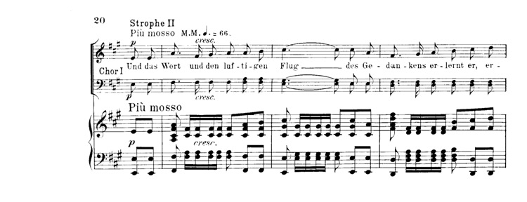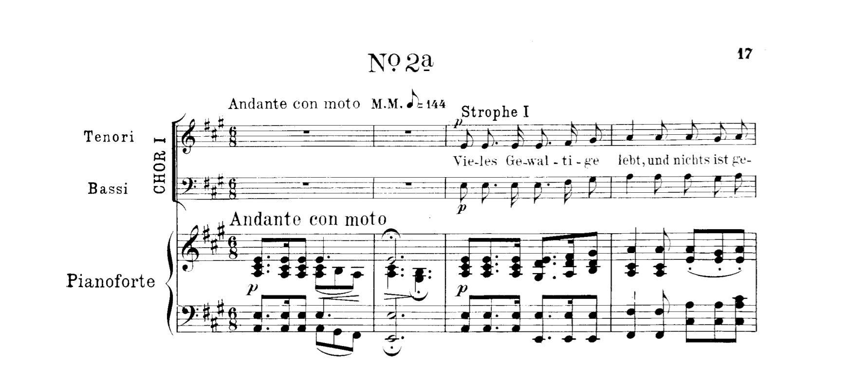 Como dijimos más arriba, se trata de la entrada de un coro fundamental de la tragedia, que se inicia con el extraordinario verso: Vieles Gewaltige lebt, und nicht ist gewaltiger als der Mensch (Muchas cosas formidables, pero ninguna más formidable que el hombre). Se imponía por lo tanto una armonía brillante, que solo podría estar lograda con acordes mayores.