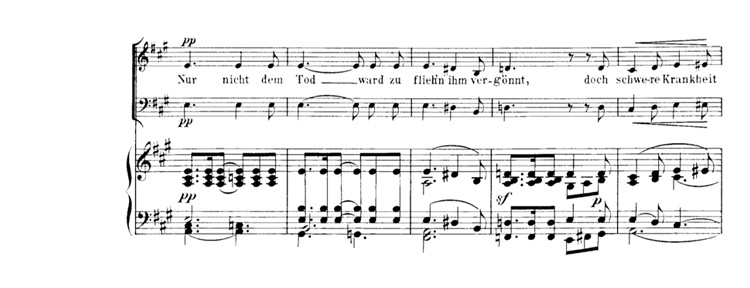 El pasaje ejemplifica bien la tensión entre una melodía y su soporte armónico en términos vagamente tonales y la entrada abrupta del acorde decididamente disonante.