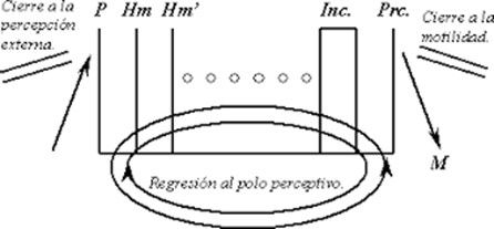 El aparato presenta una orientación espacial y temporal que va desde el polo perceptual hacia el polo motor. La percepción está en disyunción con la memoria. La recepción de estímulos del polo perceptual deja en el aparato huellas mnémicas (Hm) que van configurando el sistema de la memoria. Estas inscripciones preceden en el tiempo a la formación del inconsciente. Ahora bien, el aparato puede recorrerse en sentido inverso. Es lo que Freud llama regresión al polo perceptivo. En esa dirección, se convierte en un aparato de alucinar. El deseo inconsciente, que desconoce el tiempo y es el motor del aparato, tiende a alucinar su objeto en el intento de repetir la satisfacción primaria. La diferencia que se reencuentra en la realidad respecto de lo deseado es la de la imposible identidad de percepción en que se articula el trauma.