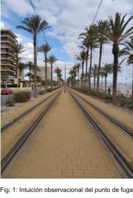 La existencia de puntos de fuga es un postulado [10] más sofisticado, que no solo tiene una base experimental. Cada par de líneas paralelas que se aleja de un observador produce el efecto visual de converger a un punto, aunque en la realidad tridimensional nunca lo hace (fig. 1). Del mismo modo, cada par de planos paralelos, por ejemplo el suelo y el techo de un pasillo muy largo, dan la impresión de converger hacia una recta.