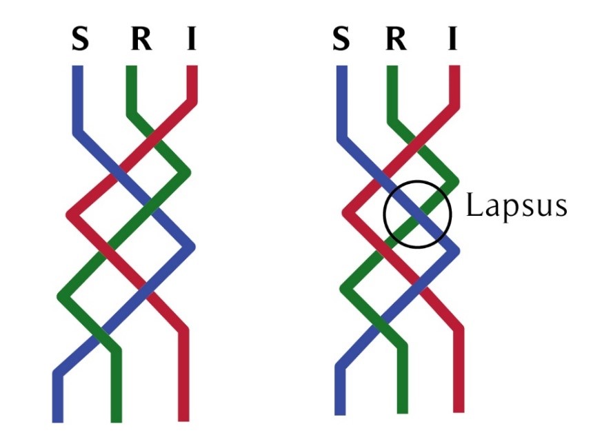 Apuntada esta cuestión presentamos en primer lugar la trenza borromea de tres hebras [2]; cada una de ellas representa un registro (real, simbólico e imaginario). En segundo lugar, introducimos el lapsus en el trenzado en un punto específico que dejará interpenetrados dos de esos registros (esto es, que cada registro pasa por el agujero del otro); en este caso, simbólico y real, quedando “suelto” lo imaginario. Luego del lapsus podemos ver que la trenza ya no es borromea, con lo cual adelantamos una hipótesis clínica: se trata de una estructura psicótica. Y precisamos, además de qué tipo: una esquizofrenia, dada la configuración de los registros efecto del lapsus producido. De este modo, la escritura de la trenza básica permite localizar el síntoma fundamental de Einar/Lili: la relación con su propio cuerpo, producto de lo que él mismo llamará un error de la naturaleza.