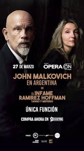 La llegada de John Malkovich a Buenos Aires en el marco de su gira internacional con la obra "El infame Ramírez Hoffman", basada en el texto de Roberto Bolaño, se produjo en un formato que combinó literatura y música en vivo. La presentación tuvo una única función de poco menos de 90 minutos en el Teatro Ópera, el viernes 27 de marzo de 2026. Las reseñas de la obra coinciden en señalar cierto despojamiento, minimalismo y “austeridad” en la propuesta, en tanto no hubo escenografía recargada ni grandes despliegues visuales, sino un dispositivo mínimo en el que Malkovich permaneció durante toda la función con la laptop abierta y leyó el texto en inglés desde un atril –mientras era proyectado en español en una pantalla de fondo negro y letras blancas– acompañado por Anastasya Terenkova (piano), Andrej Bielow (violín) y Fabrizio Colombo (bandoneón), en una puesta donde la palabra y la música constituyeron el núcleo de la experiencia. Al repertorio anticipado, que incluía piezas de Piazzolla y Vivaldi, se sumaron composiciones de The Doors y Max Richter, lo que cargó a la función de un arco musical variado.