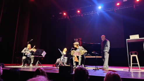 El tercer momento es el nudo más denso: una estética del desecho. Con The Doors y Oblivion de Piazzolla se narra la muestra de fotografías, donde los cuerpos de las víctimas son absorbidos por la exhibición. La atmósfera se ensombrece y se vuelve más intensa. El pulso oscuro prepara el terreno para el bandoneón de Fabrizio Colombo, el cual pasa a ocupar un lugar decisivo en la respiración de la escena. No se trata tanto de que la música “denuncie” como de que vuelva posible una torsión: cuando el arte se desprende de todo resto de humanidad, ya no sublima ni redime, sino que administra ruinas y produce cenizas.