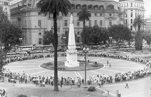 Las rondas, repiten un ritual que escribe un saber-hacer (savoir-faire) (Lacan, 1975-1976: 13-1-76) [7] compartido con la prohibición vociferada por las fuerzas del orden ¡Circulen!, burlando al amo previo en su falla e inscribiendo la ausencia. Un nuevo parto, un nuevo parir un hijo tiene lugar en ese espacio visible e histórico: la Plaza de Mayo, la plaza de la revolución. De este modo, el uso del “circulen” que buscaba impedir las agrupaciones y las congregaciones en los espacios públicos es subvertido adquiriendo un novedoso significado. Claramente obedecen presurosas, pero con ingenio inventan una estrategia exitosa: circular, ser vistas incluso por los organismos de Derechos Humanos Internacionales a los que han acudido en ayuda.